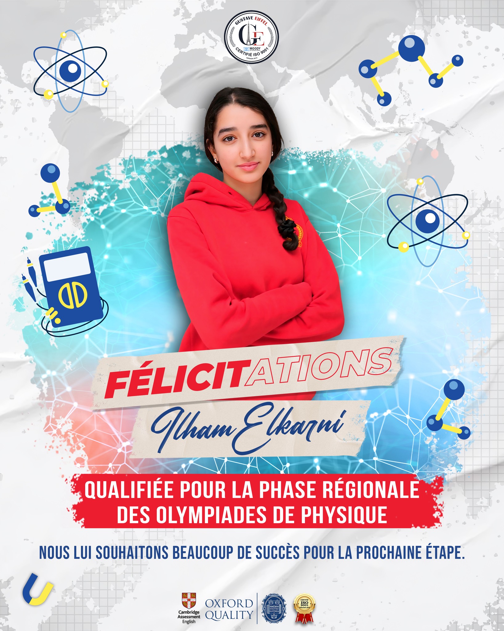 Nos sincères félicitations à notre élève Ilham El karni pour sa brillante réussite aux Olympiades de Physique et sa qualification à la phase régionale de cette prestigieuse compétition scientifique.