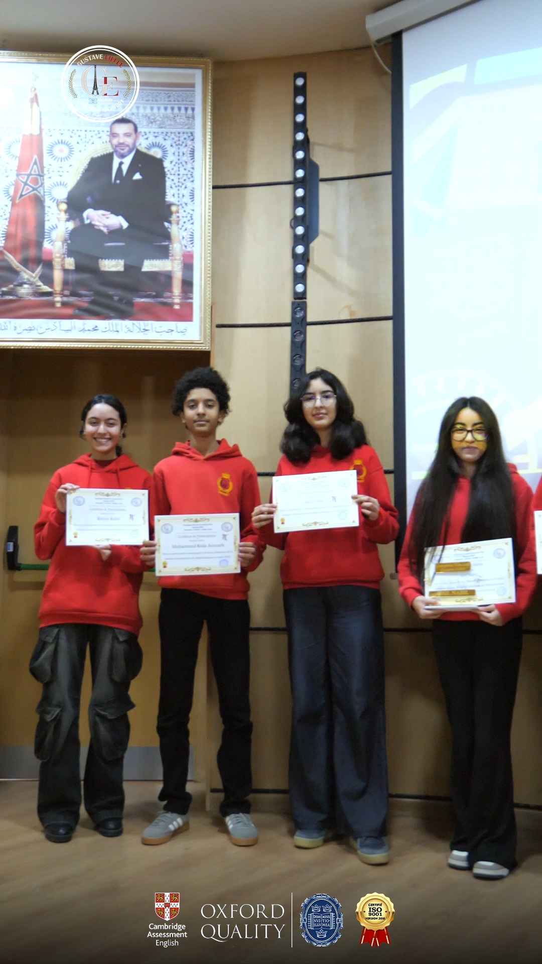 خلال الحفل سلمت جامعة أكسفورد شهادة الاعتراف بالجودة أكسفورد للمركب التعليمي و التربوي غوستاف إيفل اعترافا منها بمجهوداته الجبارة في مجال تعليم اللغة الانجليزية.